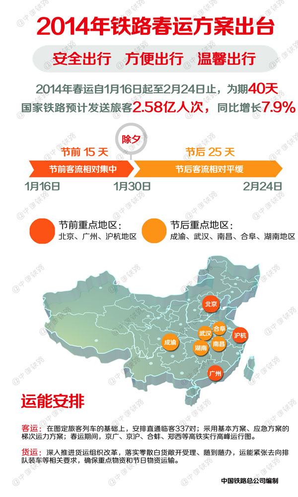 2014年春運自1月16日起至2月24日止,為期40天,其中,節(jié)前15天,節(jié)后25天。根據客流調查情況,綜合考慮鐵路運力和市場需求等因素,預計2014年春運期間,國家鐵路發(fā)送旅客25780萬人次,同比增加1893萬人次,增長7.9%。