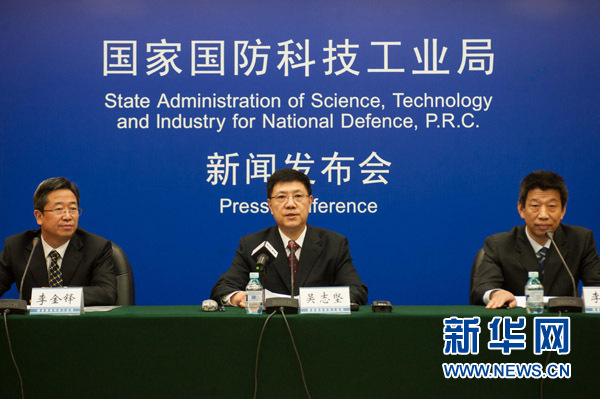 11月26日,國(guó)防科工局新聞發(fā)言人吳志堅(jiān)在發(fā)布會(huì)上介紹情況。當(dāng)日,國(guó)防科工局新聞發(fā)言人吳志堅(jiān)宣布,如果氣象等條件允許,由著陸器和巡視器共同組成的我國(guó)嫦娥三號(hào)月球探測(cè)器將在12月上旬擇機(jī)發(fā)射。據(jù)專家介紹,如果發(fā)射、飛行順利,嫦娥三號(hào)預(yù)計(jì)在12月中旬著陸月球。這將是我國(guó)航天器首次地外天體軟著陸。新華社記者 劉金海 攝