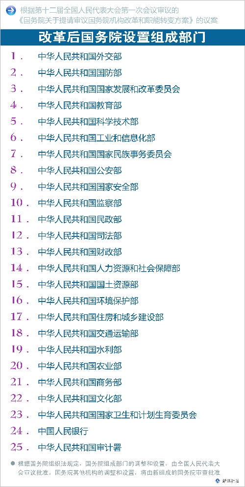 10日披露的國務院機構改革和職能轉變方案表明,新一輪國務院機構改革即將啟動,國務院組成部門將減少至25個。