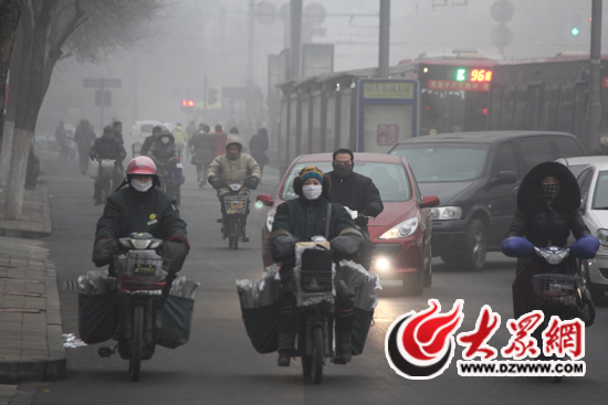 大霧天氣空氣質(zhì)量下降,路上的行人都帶上了口罩。