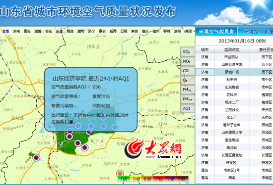 今天上午8時,濟(jì)南泉城廣場、山東經(jīng)濟(jì)學(xué)院等多數(shù)環(huán)境監(jiān)測點位,已由前幾天的“嚴(yán)重污染”降為“重度污染”。