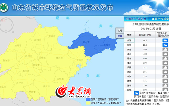 昨天,全省17地市中煙臺、威海兩市已現(xiàn)“藍(lán)天白云”,菏澤和濟(jì)南能見度全省最低,均為0.6千米。