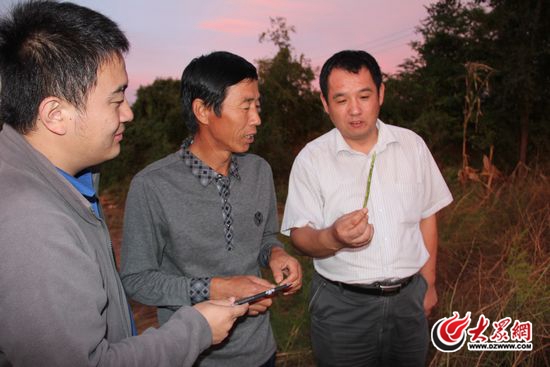 西張村“第一書記”張勇(右)和村書記張青偉(中)向記者介紹蘆筍的生長條件