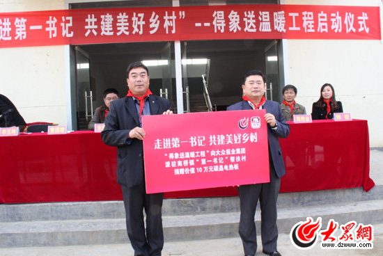 今天上午,大眾網(wǎng)聯(lián)合山東得象電器股份有限公司共同發(fā)起的“走進(jìn)第一書記,共建美麗鄉(xiāng)村”--得象送溫暖工程愛心捐贈(zèng)活動(dòng)在臨沂市蒼山縣南橋鎮(zhèn)石埠村小學(xué)正式啟動(dòng)。蒼山縣南橋鎮(zhèn)是活動(dòng)第一站,將向三個(gè)“第一書記”幫扶村的石埠村小學(xué)、界坊村小學(xué)、任橋幼兒園捐贈(zèng)10萬元的碳晶電熱板。