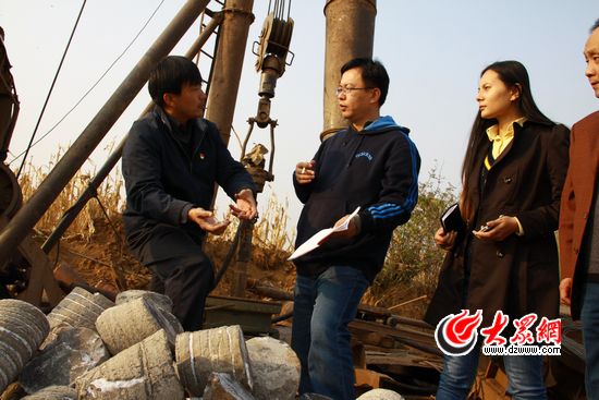來(lái)自食品醫(yī)藥監(jiān)督管理局的“第一書(shū)記”王洪坤向大眾網(wǎng)記者介紹東平縣梯門鎮(zhèn)的地質(zhì)結(jié)構(gòu)。記者 張帆 攝