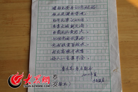 大眾網(wǎng)泰安12月3日訊(記者 李蕾 實習(xí)生 刁云龍)“楊正促諧科學(xué)觀,見件民事記心間,奎育文明新風(fēng)尚,書載民以食為天,記住黨的政策好,包村扶貧百姓歡,村民高歌齊歡唱,好人一生保平安。”一首“楊見奎書記包村好”的藏頭詩真切地反映著“第一書記”楊見奎在“包村”工作中所做出的成績。然而寫這首打油詩的人并非什么文人、學(xué)者,而是東平縣梯門鎮(zhèn)花店村的一位普普通通的農(nóng)民。
