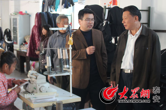 “第一書記”楊見奎(右二)在服裝廠了解情況。(實習(xí)生 刁云龍 攝)