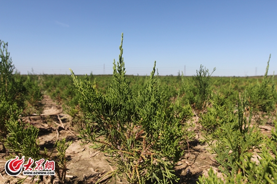 沾化以冬棗聞名全國,但在該縣的大樓鎮(zhèn)韓家糖坊村,卻很少能見到冬棗樹,這里種的最多的是龍柏。9月25日中午,大眾網(wǎng)記者在村里的百畝龍柏示范園前,看到綠油油的龍柏苗一眼望不到邊,而這個當?shù)睾苌僖姷摹跋『蔽铩笔菫I州醫(yī)學(xué)院總務(wù)處的副處長——“第一書記”雋博永引進來的“發(fā)財樹”。