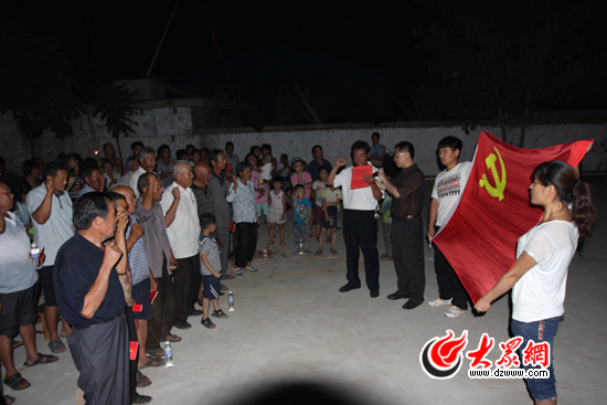 6月27日晚,一場特殊的黨員會(huì)在費(fèi)縣南張莊鄉(xiāng)太白村的健身廣場舉行。19名黨員在“第一書記”劉兵的帶領(lǐng)下重溫入黨誓詞。