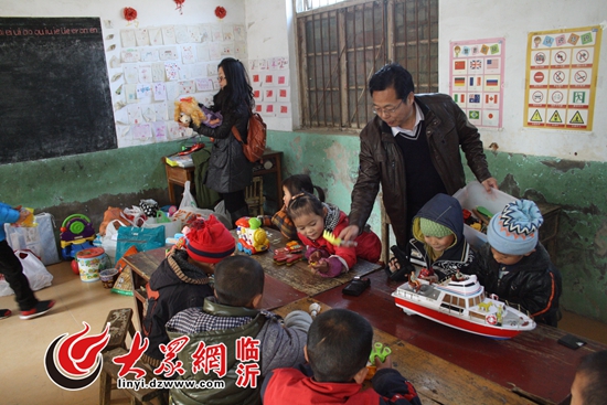 “第一書記”將青島大學捐贈的玩具和圖書送到孩子們手中。