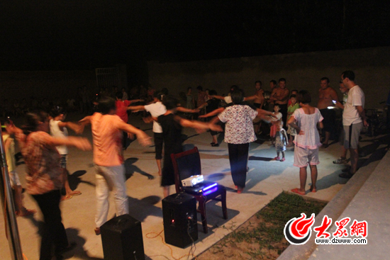 42歲的村民劉祥龍抽著自己卷的旱煙,瞇著眼吐出一個不圓的煙圈,他妻子馮貴芬也在跳舞的隊伍里,只要不下雨,天天都來跳。以前兩口子干完農活回到家,吃了晚飯就睡覺,這兩個月以來,妻子天天拉著他來看,不大懂女人心思的老劉看了好幾天才明白過來:原來妻子穿上那條黑色連衣裙還是挺漂亮的!那是前幾年給妻子買的,平時在家很少有合適的場合穿,現在天天穿上來跳舞,看著效果還不錯!皼]想到咱老農民也能參加個舞會了,嘿嘿,不孬!”。
