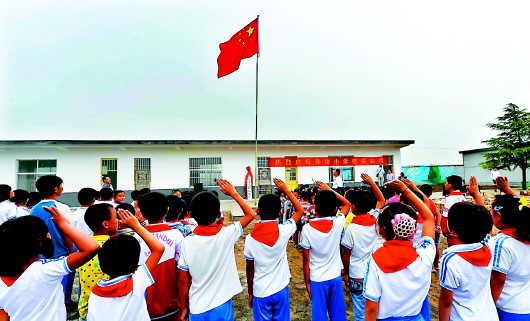 今天,界坊小學(xué)第一次升起了國旗(左圖)。這個(gè)村3年級以下的孩子在家門口就可以坐在寬敞明亮的教室里學(xué)習(xí)知識,再也不用跑到三四公里之外的小學(xué)就讀。不僅如此,孩子們還得到了圖書、書包、教具、玩具等大宗“禮物”。