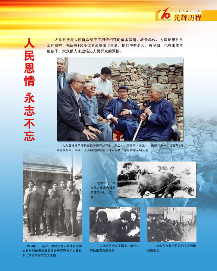12月31日1985年5月7日,報社老同志與大眾日報創刊地沂水縣的老房東在一起。創刊之時,匡亞明根據大眾日報的宗旨“立足于大眾,大眾辦,大眾看”,提議報名為“大眾日... -