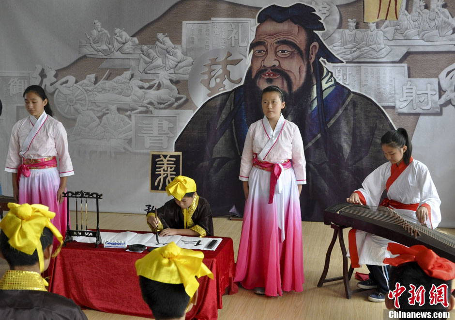 9月27日,濟(jì)南明湖中學(xué)的學(xué)生身著漢服誦《論語》,習(xí)“六藝”,紀(jì)念中國(guó)古代偉大的思想家、教育家、哲學(xué)家、儒家學(xué)派創(chuàng)始人孔子誕辰2564周年。中新社發(fā) 張勇 攝