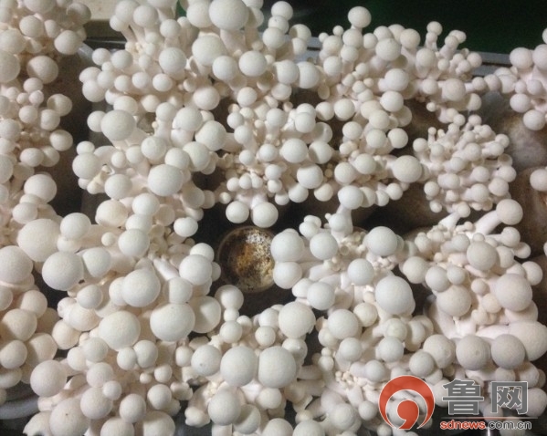 生產(chǎn)車間內(nèi),從上方看白玉菇如同小顆雞蛋