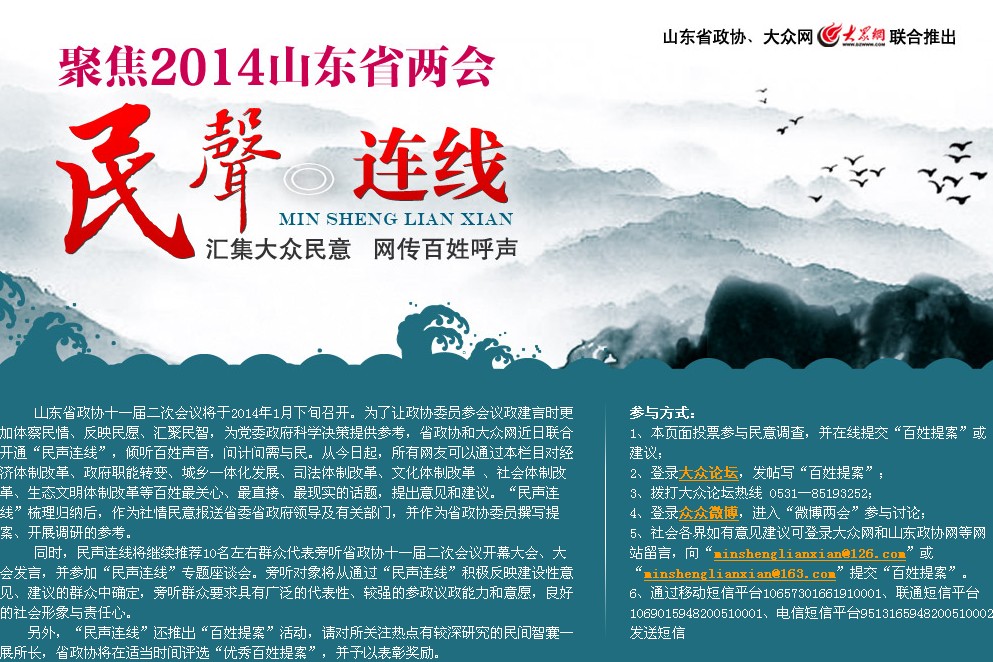 從今天起,網友可登陸省政協和大眾網聯合開通的“民聲連線”欄目(http://55rrmm.com/2013/msrx/),參與大眾網推出的大型民意調查,并在山東經濟、政治、文化、社會和生態文明體制改革以及現代市場體系完善、政府職能轉變、城鄉一體化發展、自由貿易區建設等最直接、最現實的話題板塊中,投票選擇你最關心的問題。