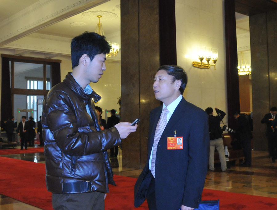 3月15日(星期五)上午9時,十二屆全國人大一次會議在人民大會堂舉行第五次全體會議,決定國務院總理的人選;決定中華人民共和國中央軍事委員會副主席、委員的人選;選舉最高人民法院院長;選舉最高人民檢察院檢察長。圖為全國人大代表蔡昉接受新華網、中國政府網記者采訪。宋君毅攝
