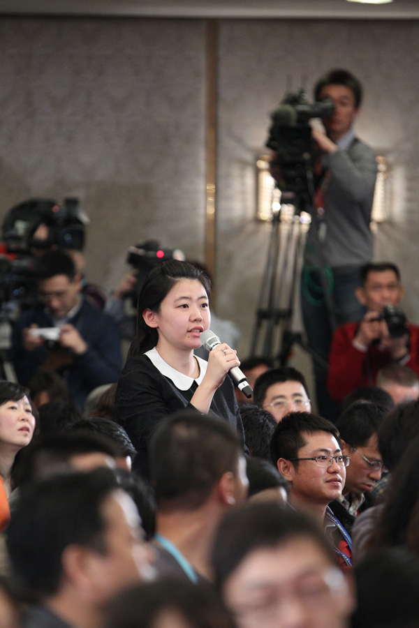3月4日,十二屆全國人大一次會議在人民大會堂一層新聞發(fā)布廳舉行新聞發(fā)布會,由大會發(fā)言人就會議議程和人大工作相關(guān)的問題回答中外記者的提問。圖為中國日報(bào)記者提問。新華網(wǎng)/中國政府網(wǎng) 王悅威 攝