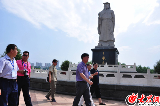19日,南線媒體采訪團(tuán)來到臨沂書法廣場,記者們仔細(xì)欣賞王羲之留下的臥碑書法。(大眾網(wǎng)記者 李兆輝攝)