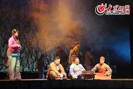該劇以濃郁的黑土氣息和多變的藝術(shù)表現(xiàn)手法,加上演員李雪飛等人的精彩演繹,贏得了在場近千名淄博觀眾的滿堂喝彩。7時(shí)30分,龍江劇《鮮兒》正式開演,在悲壯的背景音樂聲中,一群衣衫襤褸的人們相扶相攜,邁著緩慢而堅(jiān)定的步伐出現(xiàn)的舞臺(tái)中央。