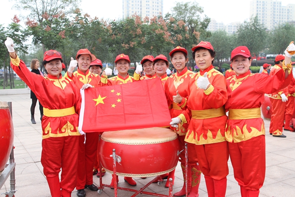 臨沂老年協會威風鑼鼓隊的大媽們在臨沂沂河橡膠壩與國旗合影為中國點贊。