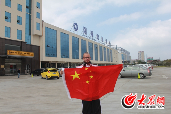 9月29日,來自西班牙在臨沂工作的丹尼爾(音),在中國臨沂跨國采購中心,與中國國旗合影,為中國點贊。