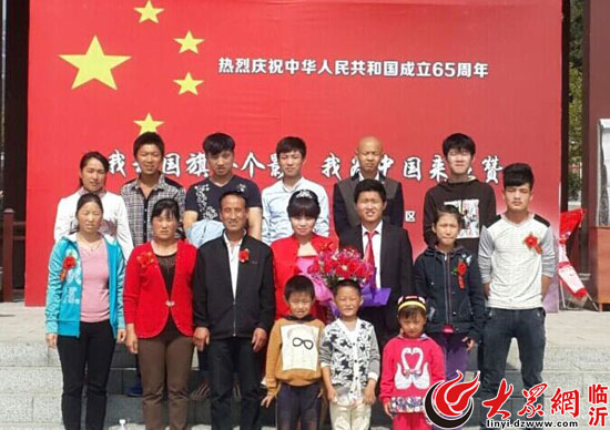 當地市民結婚當天來到蒙山在國旗前拍全家福 新婚志喜與祖國65周年同慶