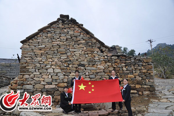 臨沂沂蒙革命紀念館工作人員在紀念館前與國旗合影為中國點贊
