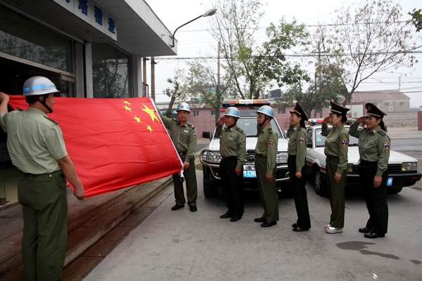 9月28日,博興縣交通運輸局執法人員向國旗敬禮。