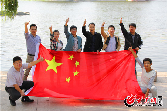 大眾網萊蕪記者站工作人員和國旗合影,為中國點贊。