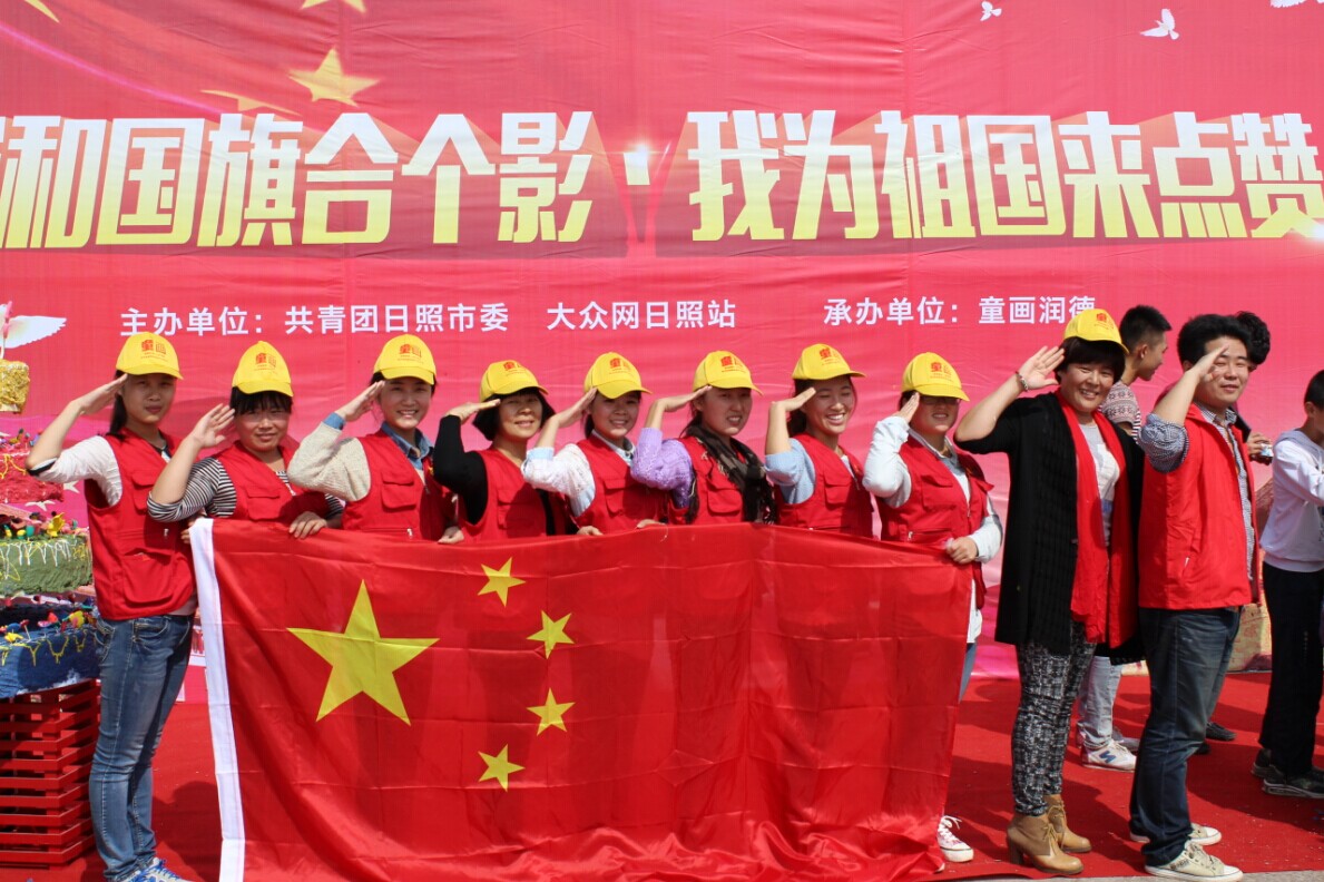日照市萬平口景區,“我和國旗合個影 我為祖國來點贊”活動現場,小朋友們手拿國旗與國旗合影,為祖國點贊。