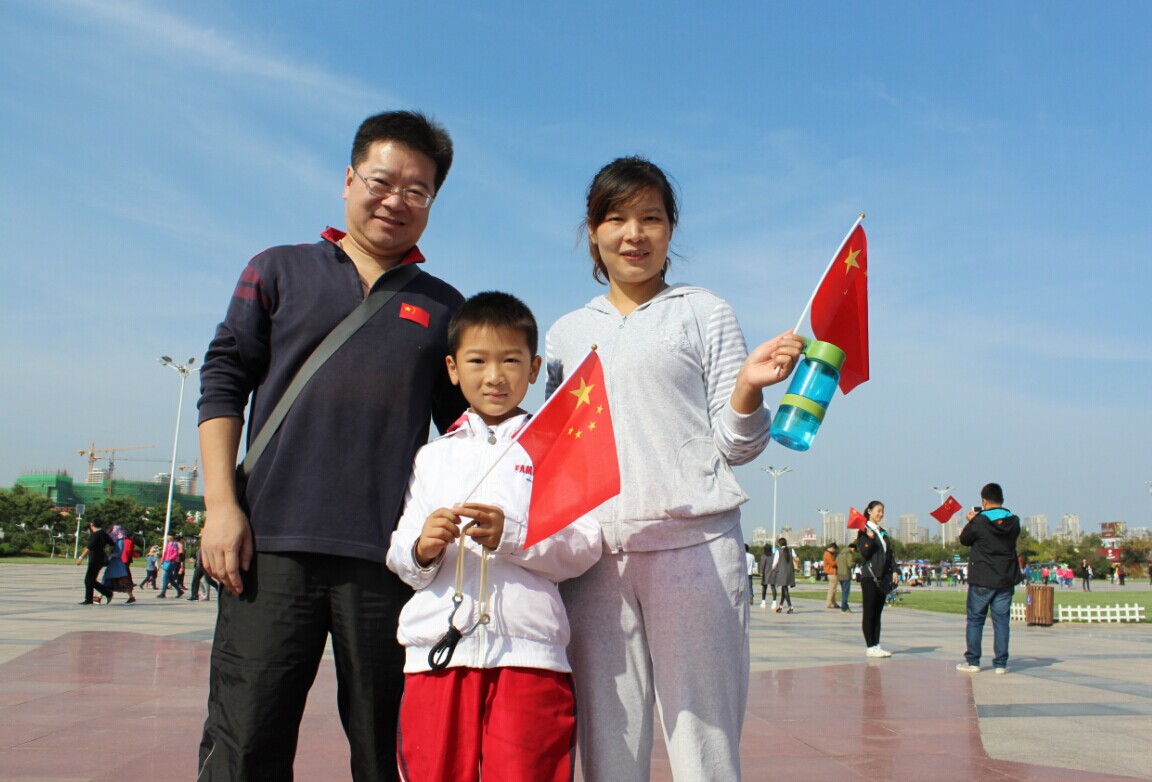 日照市萬平口景區,一家三口與國旗合影,為祖國點贊。