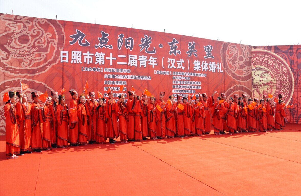“九點陽光?東關里”日照2014年青年漢式集體婚禮現場,18對新人與國旗合影,為祖國點贊。