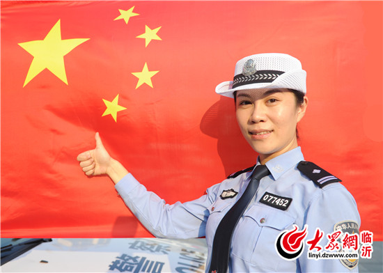 臨沂交警直屬一大隊宣傳科科長曲紅與國旗合影,為中國點贊
