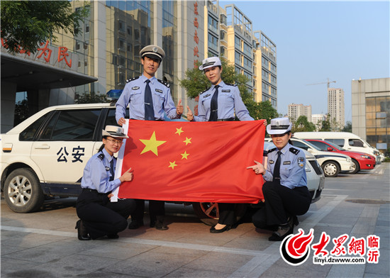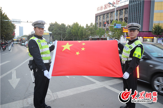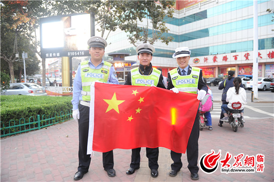 臨沂直屬一大隊執勤民警在金雀山路與沂州路交會處,與國旗合影,為中國點贊