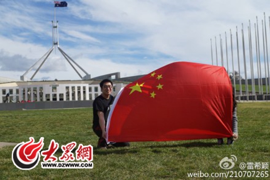雷希穎:活動是9月6號發起的,當時就是在微博開了一個話題,分享了自己的一些和國旗合影的照片。我到澳大利亞將近4年,微博、微信這些自媒體是我們留學生關注國內時事最便捷的平臺。在我使用微博、微信的過程中,覺得現在的網絡輿情有些問題,在網上正常表達愛國之情反而成了敏感的事,不時地會受到攻擊、辱罵和嘲諷。今年正值建國65周年和抗戰勝利69周年,我想從自身做起,利用這樣的輿論氛圍改變網絡輿論環境,讓大家能夠看到一個更加客觀和全面的中國。