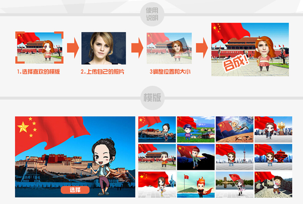 登陸大眾網(wǎng)專題( http://www.55rrmm.com/2014/gq/),下拉找到互動專區(qū),在天安門、長城、布達拉宮、內(nèi)蒙古草原、月球、泰山、釣魚島等十余個場景模板中挑選自己喜歡的模板,通過鼠標點擊選擇。