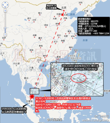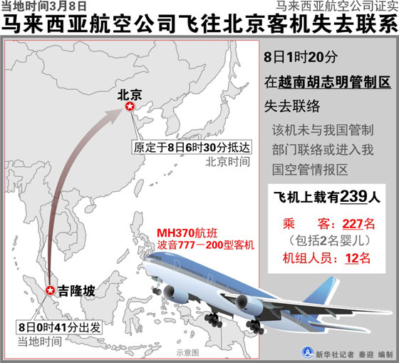 #馬航飛機失聯(lián)#【一載239人由吉隆坡飛北京的航班失聯(lián) 機上有160名中國人】馬來西亞航空發(fā)表聲明說,該公司一架從吉隆坡飛往北京的航班失去聯(lián)絡。該飛機航班號為MH370,機型波音777-200,載有239人,包括兩名嬰兒。原定今早6時30分抵達北京;在越南曾與空管聯(lián)系后失聯(lián)。目前搜索工作已展開。祈禱平安!