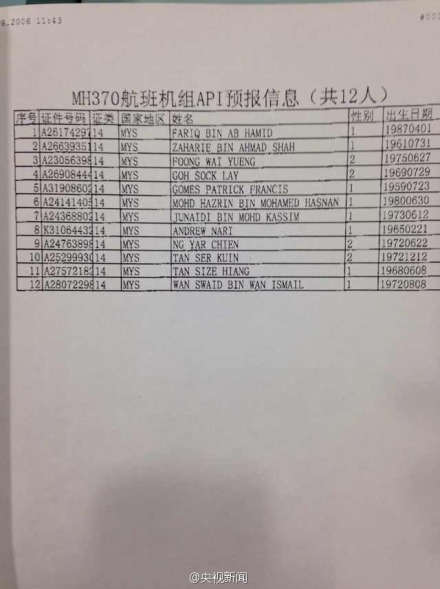 #馬航飛機失聯(lián)#【機上中國人數(shù)字更新為154名】@北京邊檢 發(fā)布微博,根據(jù)北京出入境邊防檢查總站指揮中心消息,航空公司申報的旅客信息顯示,該航班上共有239人,其中中國人154名,外國人73名,機組員工12名。祈禱平安!