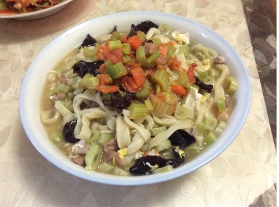 奶奶搟的面條,媽媽做的蕓豆肉丁湯,我炒的芹菜西紅柿。這就是我們家的母親節晚餐。