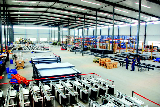 。忌綎|蘭劍物流科技有限公司投資6億元,在臨邑縣東部高新區(qū)規(guī)劃建設(shè)的集物流裝備研發(fā)制造、物流軟件開(kāi)發(fā)、物流信息服務(wù)于一體的物流裝備與技術(shù)產(chǎn)業(yè)基地。圖為正在組裝的煙草分揀車間。