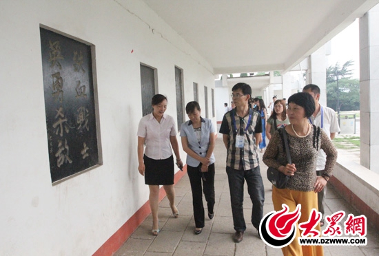 記者們在鐵道游擊隊紀念廣場觀看墻壁上的石碑。 記者 郭豪 攝