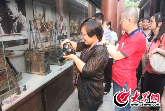 采訪團(tuán)記者來(lái)到棗莊市薛城區(qū)的鐵道游擊隊(duì)影視城,記者們進(jìn)入魯南民俗博物館了解魯南民俗情況。 記者 郭豪 攝