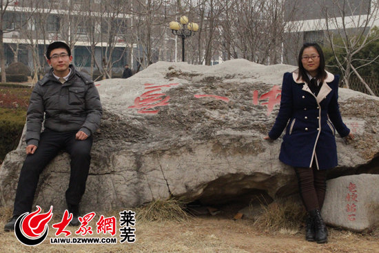 “情系母校”支隊孫其星(左)、鄒海萍(右)在萊蕪一中合影留念(見習記者 馮建華 攝)