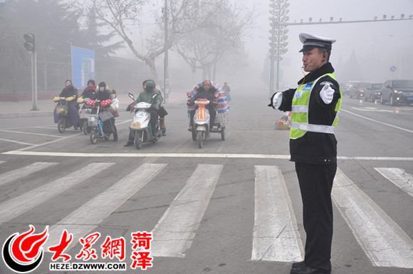 大眾網(wǎng)菏澤1月30日訊(記者 郭 豪)30日下午1時,大霧彌漫,萬家希換上制服,走上執(zhí)勤崗,開始今天的執(zhí)勤。今年是大年三十,萬家希及城區(qū)其他180名交通民警和往常一樣站崗執(zhí)勤,在2014年春節(jié)前一天,他們堅持站好最后一班崗。