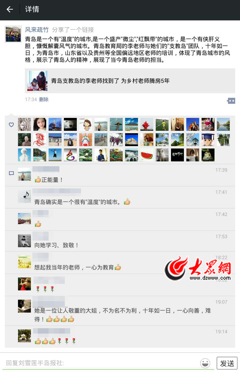 “風(fēng)來疏竹”的說法受到朋友們的一致認(rèn)可,大家點(diǎn)贊不斷。大眾網(wǎng)官方微信發(fā)表的《是這么一名山東女子,讓貴州的185位鄉(xiāng)村教師如此感動(dòng)和想念》也被網(wǎng)友紛紛轉(zhuǎn)發(fā),朋友圈里被“支教島”和李淑芳刷屏。