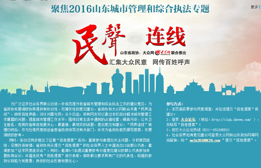 本次省政協(xié)“民聲連線”活動的征集時間為3月10日至5月20日,除在大眾網(wǎng)等媒體網(wǎng)絡平臺推出大型民意調(diào)查外,還推出征集“百姓提案”活動,歡迎廣大群眾圍繞城市管理和綜合執(zhí)法提出關注問題、分析原因癥結(jié)、設想改進舉措。您身邊有亂倒生活和工業(yè)垃圾、違章占道擺攤的現(xiàn)象嗎?您關心危舊房屋的整改拆除、外來人口的醫(yī)療教育及管理問題嗎?您目前所在城市的管理效果如何,存在哪些突出問題?您對于城市管理執(zhí)法隊伍的評價如何,有啥好點子好想法嗎?歡迎登陸大眾網(wǎng)相關專題(http://55rrmm.com/2016/jj2016/)、省政協(xié)網(wǎng)站、聯(lián)合網(wǎng)等網(wǎng)絡平臺投票留言,在線提交“百姓提案”。您還可以關注“山東政協(xié)”微信公眾號后在“民聲連線”欄目提交建議,或發(fā)送郵件至minshenglianxian@163.com,提出您對規(guī)范城市管理和綜合執(zhí)法工作的建議、期待。