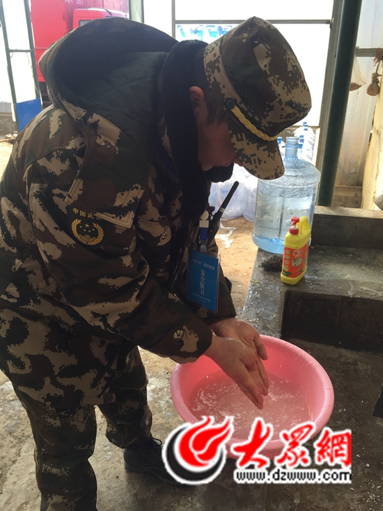 24日7點30分,早飯做好了,早餐很簡單,只有面條。大眾網記者注意到,吃飯前,工作人員在滿是碎冰的盆子里洗手!拔覀兌剂晳T了!币粋小伙子說。