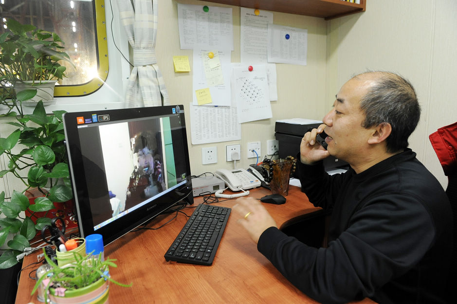 晚上8點,新勝利鉆井一號平臺的經(jīng)理室里,趙忠生與妻子通過網(wǎng)絡(luò)視頻聊天,因為網(wǎng)絡(luò)、手機信號質(zhì)量都不好,所以他同時撥通手機輔助交流。大眾日報 作者:盧鵬 編輯:孫京濤