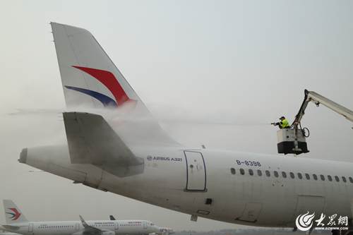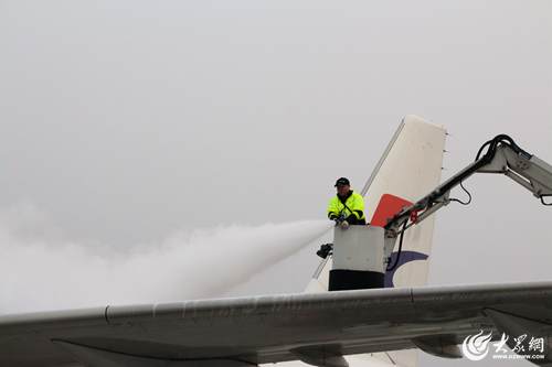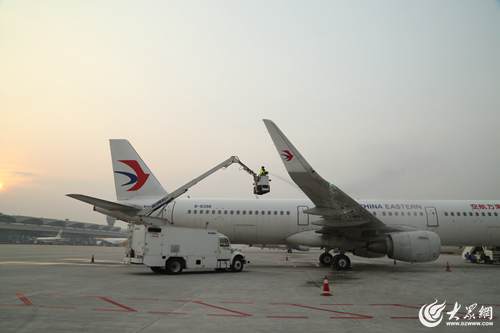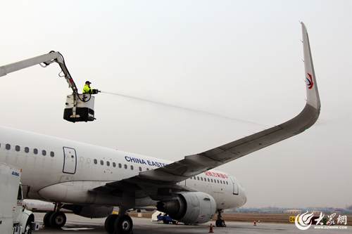 1月18日早晨7時許,氣溫跌破零下4度,青島流亭機場停機坪內,東航機務維修人員凌學偉正操控著移動工作梯,時上時下,將噴頭瞄準一架飛機的機翼、機身除冰霜。